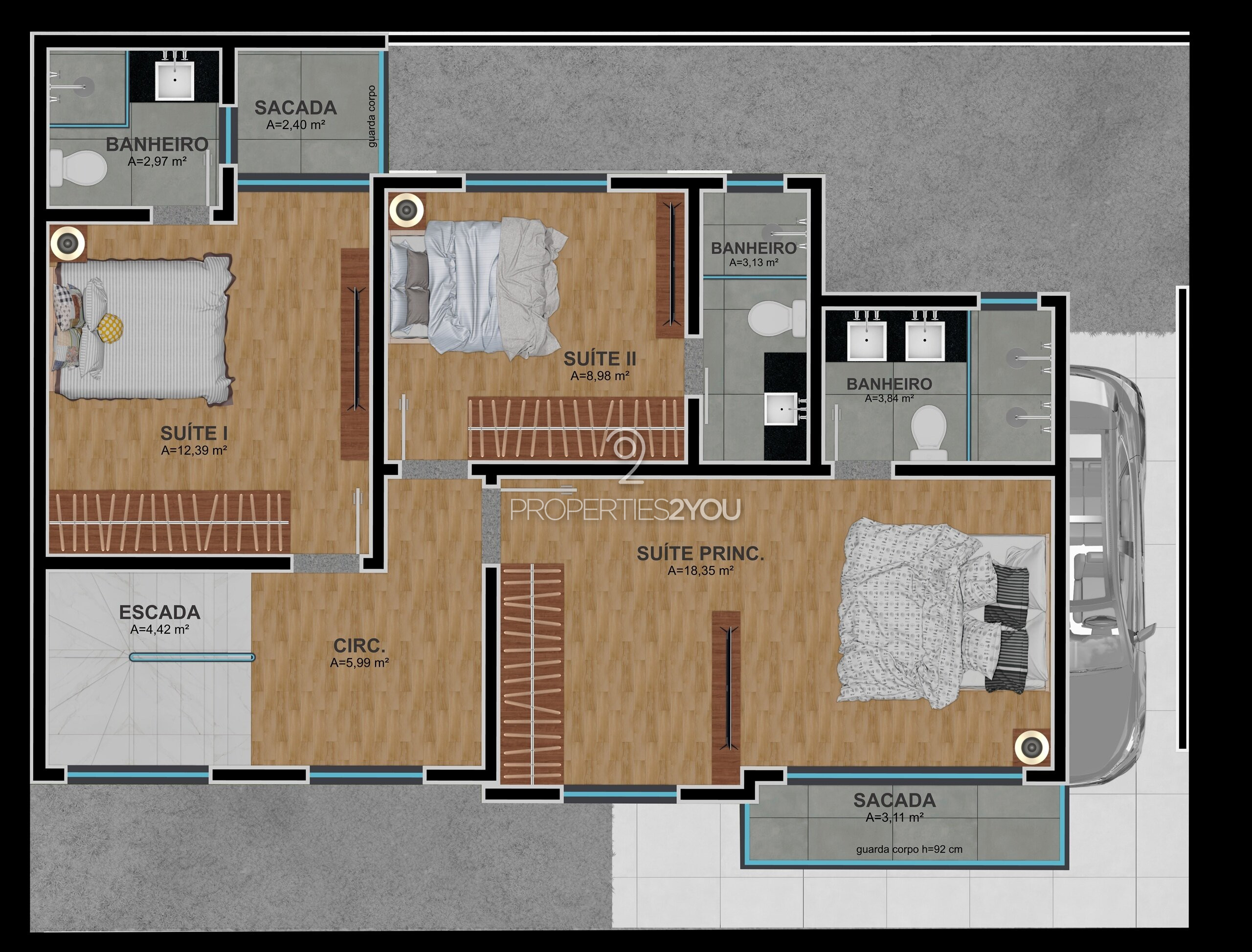 No pavimento superior, o bem-estar é protagonista: três suítes projetadas para oferecer conforto e privacidade. Destaque para a suíte master, com closet integrado, sacada exclusiva e banheiro com cubas e duchas duplas uma combinação perfeita entre versatilidade e elegância.